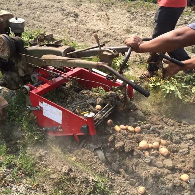 山東曹縣魯富機(jī)械廠生產(chǎn)的,收獲機(jī)與小四輪拖拉機(jī)傳動(dòng)軸連接,經(jīng)主傳動(dòng)軸上偏心塊、連桿帶動(dòng)挖掘鏟作前后往復(fù)運(yùn)動(dòng),再由傳動(dòng)軸左端齒輪帶動(dòng)過(guò)橋軸上變速齒輪,并改變傳動(dòng)方向,再經(jīng)鏈條帶動(dòng)分離排鏈主傳動(dòng)軸,并由主傳動(dòng)軸兩端偏心塊帶動(dòng)振動(dòng)篩上下抖動(dòng)。在拖拉機(jī)的牽引下,使挖掘鏟挖掘出來(lái)的馬鈴薯(大蒜、地瓜等)鋪放在分離排鏈上,在分離排鏈的轉(zhuǎn)動(dòng)下土落在分離排鏈下方,馬鈴薯(大蒜、地瓜等)和未落下的土塊,在分離排鏈上面落在振動(dòng)篩上,再次清選分離后集中鋪放在機(jī)后地面上。