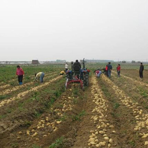 山東曹縣魯富機(jī)械紅薯收獲機(jī)與小四輪拖拉機(jī)傳動(dòng)軸連接,經(jīng)主傳動(dòng)軸上偏心塊、連桿帶動(dòng)挖掘鏟作前后往復(fù)運(yùn)動(dòng),再由傳動(dòng)軸左端齒輪帶動(dòng)過(guò)橋軸上變速齒輪,并改變傳動(dòng)方向,再經(jīng)鏈條帶動(dòng)分離排鏈主傳動(dòng)軸,并由主傳動(dòng)軸兩端偏心塊帶動(dòng)振動(dòng)篩上下抖動(dòng)。在拖拉機(jī)的牽引下,使挖掘鏟挖掘出來(lái)的馬鈴薯(大蒜、地瓜等)鋪放在分離排鏈上,在分離排鏈的轉(zhuǎn)動(dòng)下土落在分離排鏈下方,馬鈴薯(大蒜、地瓜等)和未落下的土塊,在分離排鏈上面落在振動(dòng)篩上,再次清選分離后集中鋪放在機(jī)后地面上。