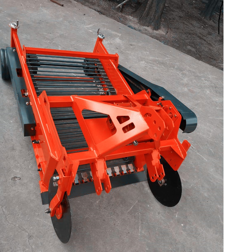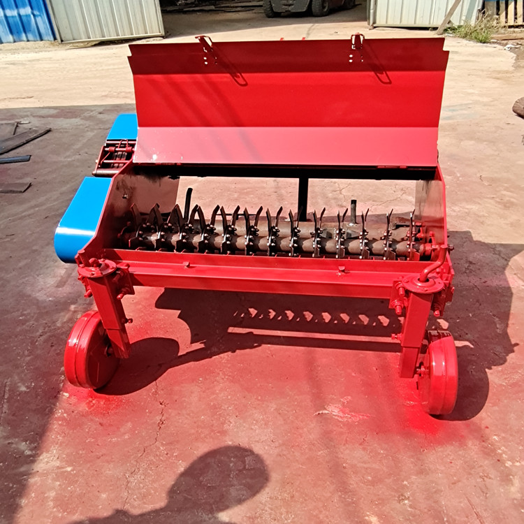 這種收獲機適用含水量為10%~18%的砂壤紅薯地。作業(yè)時,挖掘鏟將紅薯連同土壤鏟起,在拋土輪和撥送輪的拋擊作用下,土塊被打碎并漏走一部分,然后經(jīng)3個分土輪的指桿連續(xù)拋擲,將細(xì)土塊和碎土粒通過圓弧形條桿篩排出,紅薯及少量細(xì)根與細(xì)土則被拋至擺動式清選篩,細(xì)土等通過篩孔排出,紅薯果由篩面滑入兩側(cè)的果箱。