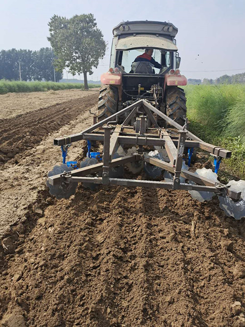 21年山東菏澤曹縣新款無墑溝大犁廠家批發(fā),本實用新型式一種無墑溝懸掛犁,包括深和平墑器機,平墑器設置在深耕犁尾部,深耕犁包括雙橫梁犁架,雙面犁鏵,連接件,單面犁鏵,限深輪,雙橫梁犁架上橫向設置有橫梁,雙橫梁犁架左右兩側設置有限深輪,雙橫梁犁架前端設置有雙面犁鏵,橫梁上固定有連接件,連接平墑器,是深耕后無墑溝,無需人工平墑,大大節(jié)省了履帶力,節(jié)約種植時間。得到廣大農(nóng)戶一致好評!